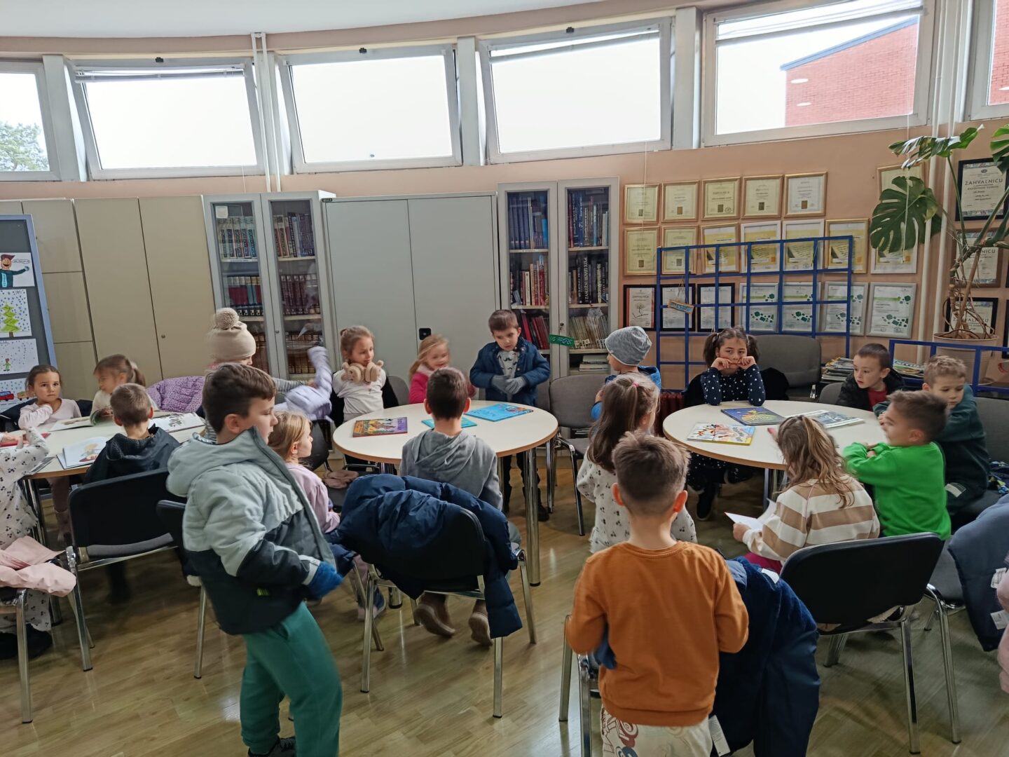 U srijedu 26. studenog našu školsku knjižnicu posjetila su djeca iz Dječjeg vrtića Novo Brestje, skupina Dupini – naši budući prvašići. U pratnji svojih odgajateljica veselo su stigli do škole, razgledali školske hodnike te se upoznali s prostorom u kojem će uskoro i sami provoditi školske dane. U knjižnici smo se lijepo podružili uz prigodnu priču, razgovarali o knjigama, slikovnicama i o tome zašto je važno čitati. Djeca su s velikim zanimanjem slušala i aktivno sudjelovala u razgovoru. Kao poklon  donijeli su svoje crteže koji će od sad krasiti zid školske knjižnice kao podsjetnik na ovo prelijepo druženje. Zahvaljujemo odgajateljicama i djeci na posjetu i veselimo se novom susretu i budućim zajedničkim čitateljskim avanturama!